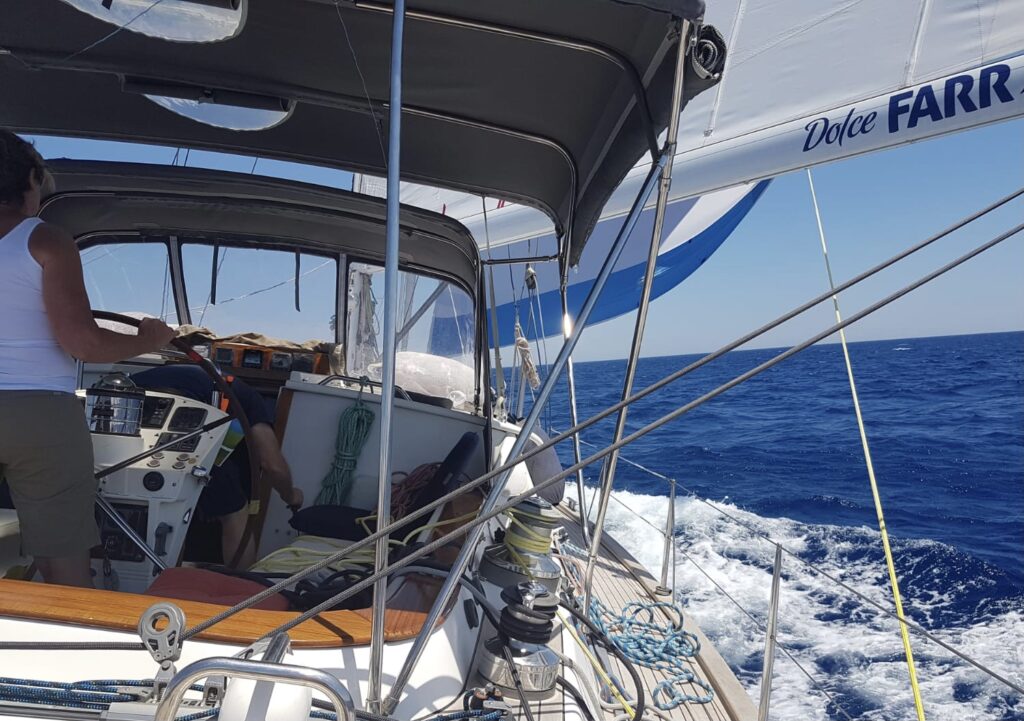 It was kind of a relief to get away from a town again. We were headed another short distance to Datca. We had good winds for a change. Instead of heading directly to our next stop, we had some fun sailing, tacking and learning the ins and outs of our sails.