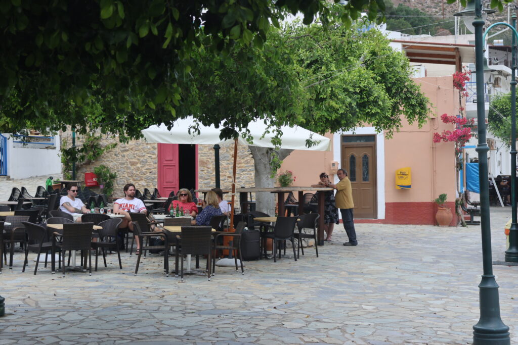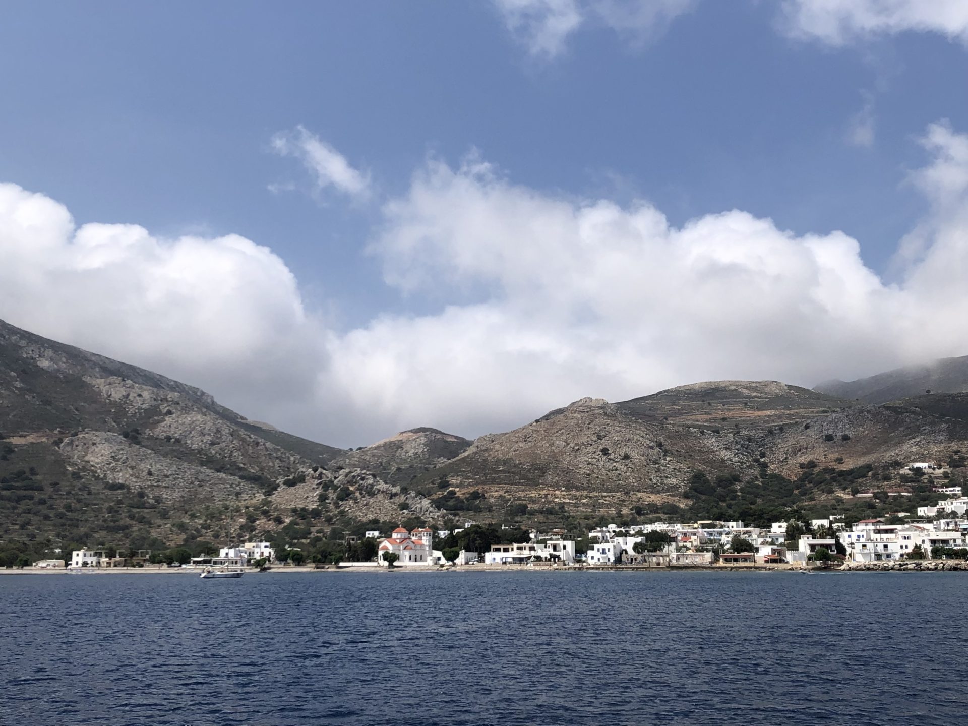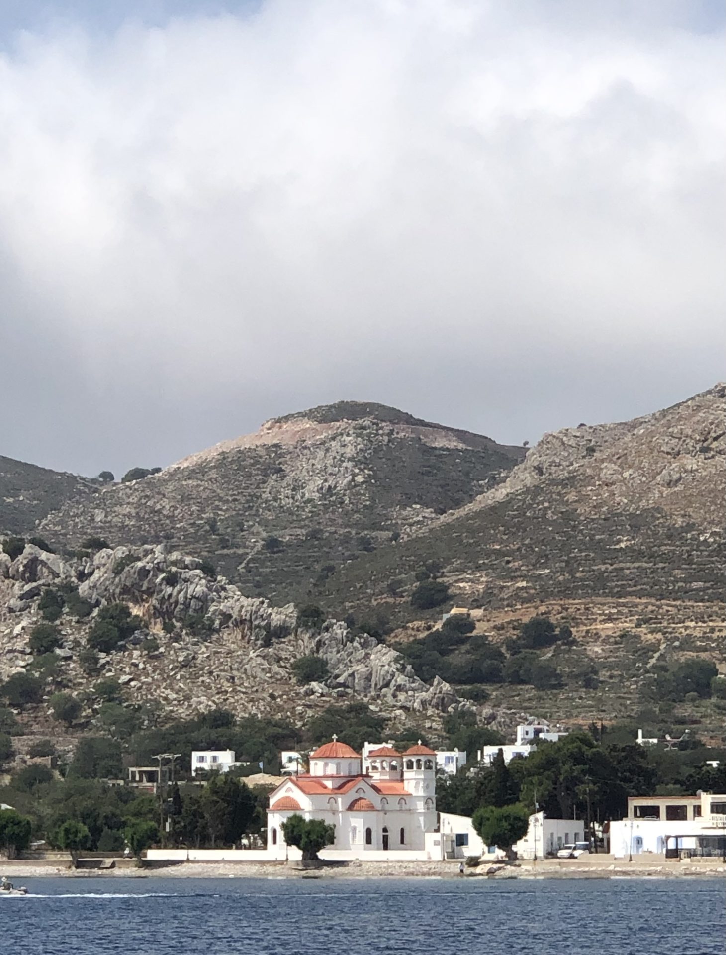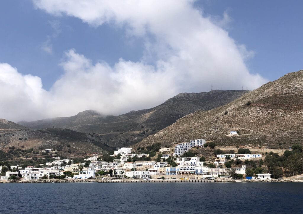 We docked at the town quay at Tilos. Tilos is a small island and it felt like it had been hit hard by the past two or three years of reduced travel. Still in all, there were travellers there now… …old people with their walking sticks and fellow cruisers. We hopped on the local bus and had a full tour of the island and later had a swim at the beach at the resort just beside the town. We spent two nights on Tilos. The first night a tremendous thunderstorm rolled through, the rain gave DFN a much-needed shower.
