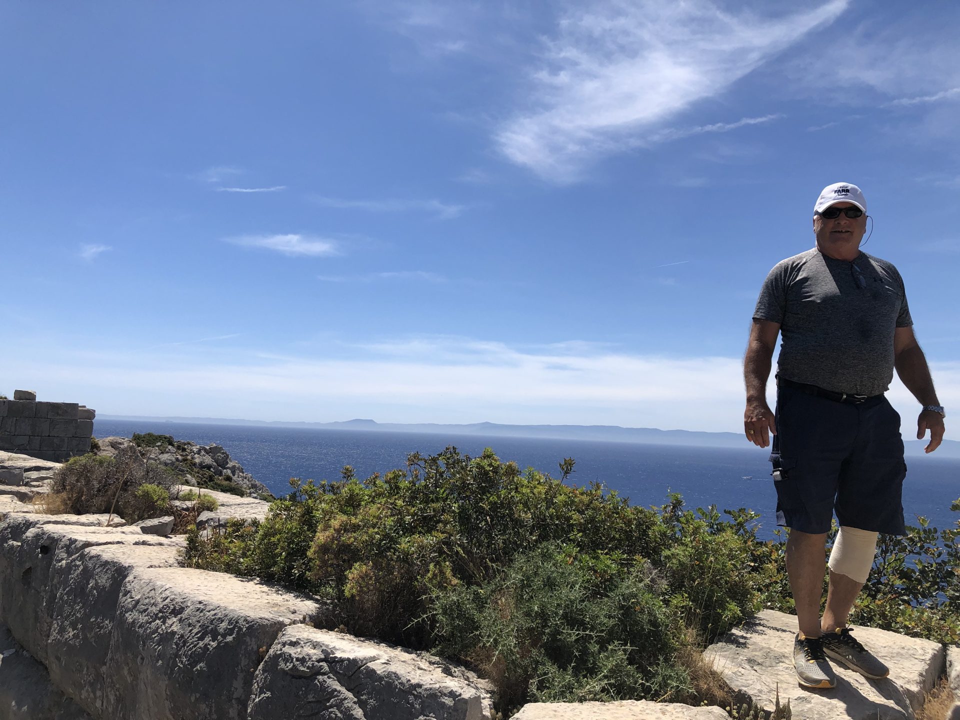 Bozuk Buku is very close to Greece, we skirted the island of Rhodos on route. That is Rhodos on the horizon behind Roger at the citadel. You can see the landscape is looking more white, like Greece, here.