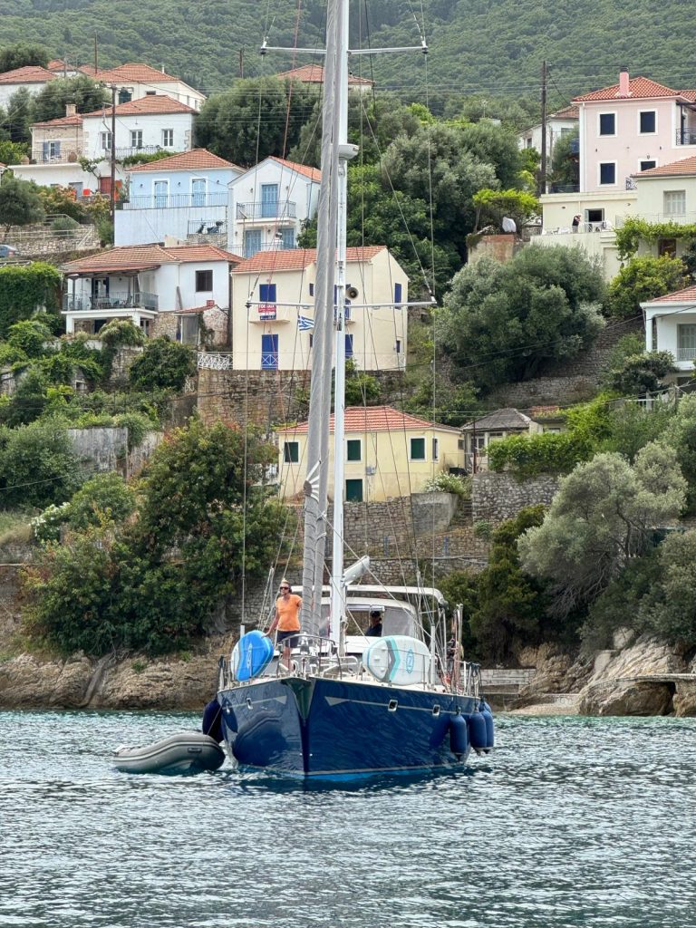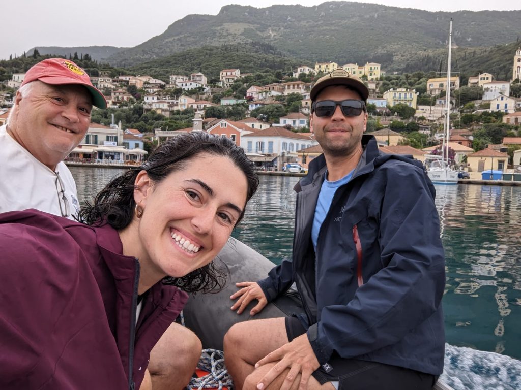 We spent a couple of days around Lefkada, two nights at anchor near a beach close to the town Nydri and one night at a dock in Nydri. The beach anchorage gave us a chance to swim and get our sea legs. We were close enough to town that we could take the dingy for supplies or exploring. Nick started to show his culinary skills… …first up homemade Bolognese sauce. We moved to the dock to get the alternator serviced (turns out we just needed a fuse) and to seek shelter from a forecasted strong wind.