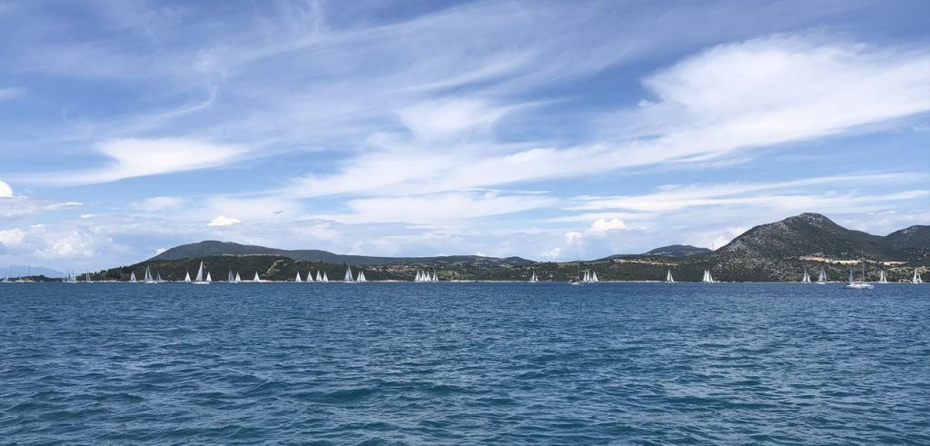 We left Preveza and made the short trip to the island of Lefkada. Lefkada is close enough to mainland Greece to be connected by a causeway and floating bridge. We timed our arrival at the bridge for the opening at the top of the hour. We picked our way through a sailing regatta upon exiting the canal.
