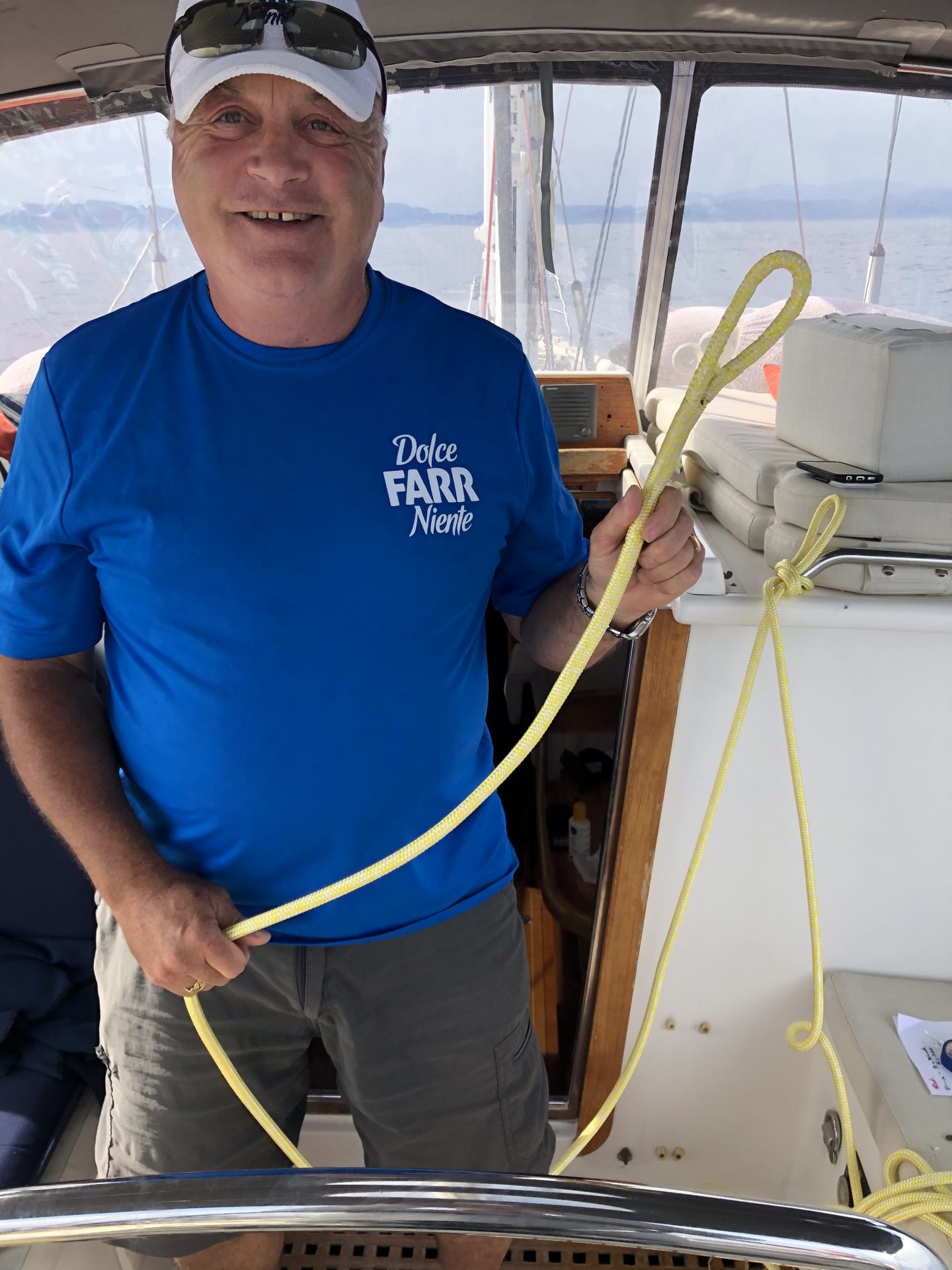 Roger’s happy face… …”I just saved 50 euros.” He taught himself to make this samson braid eye splice while on route to Gocek.